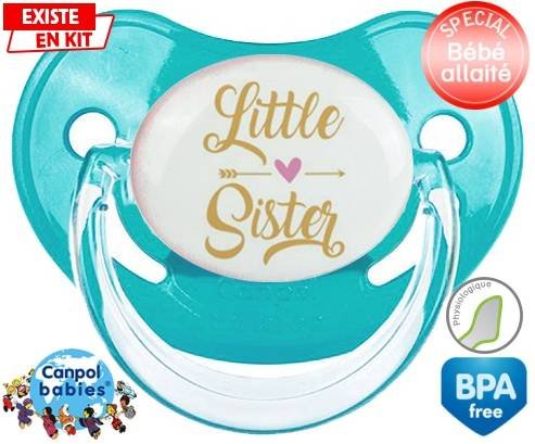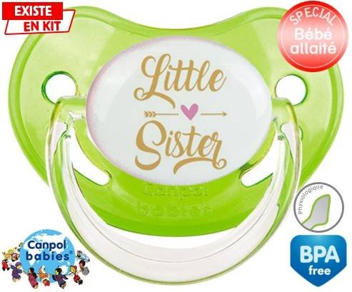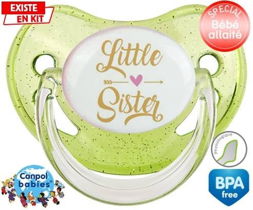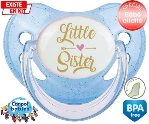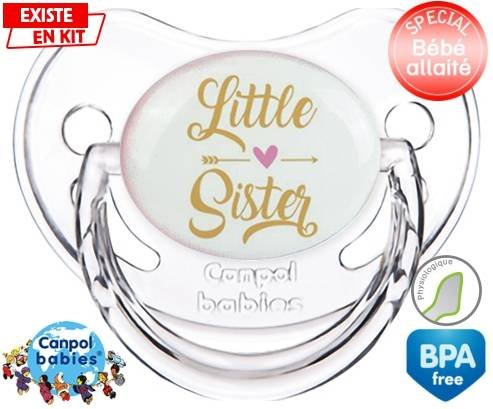 Sucette personnalisée pour bébé Little sister à embout Physiologique en silicone de la marque Canpol Babies avec impression en en Couleurs de la collection Message.La silicone se reconnaît par sa couleur transparente. C'est une matière souple, douce, sans goût ni odeur et offre à bébé une succion plus facile grâce à sa souplesse.