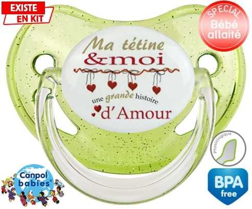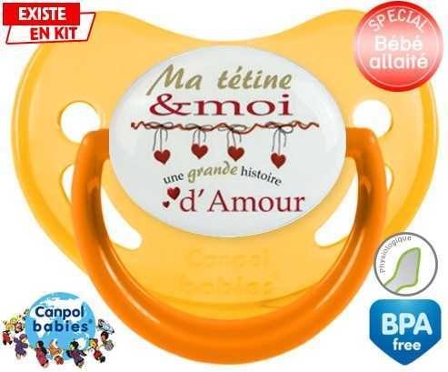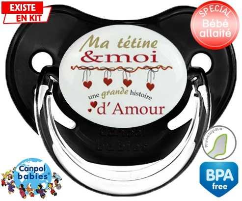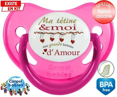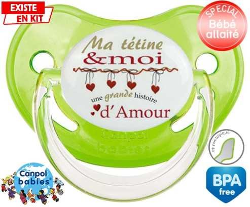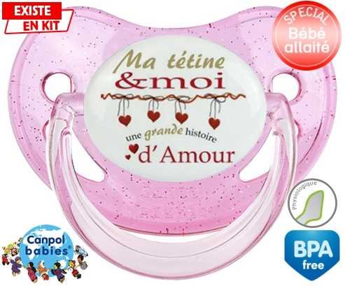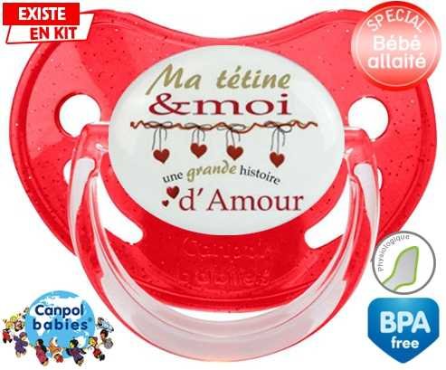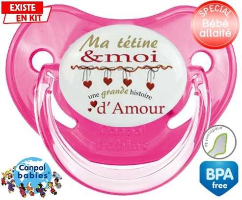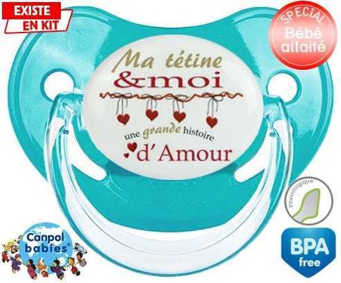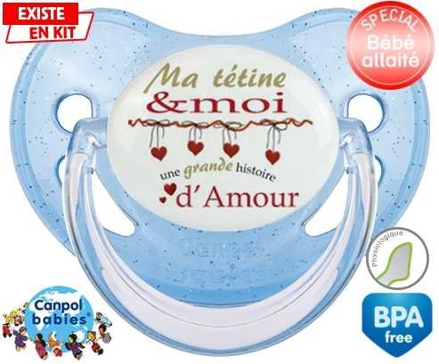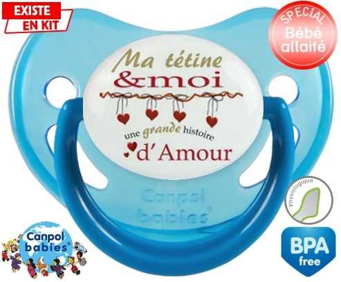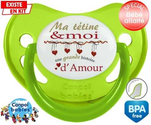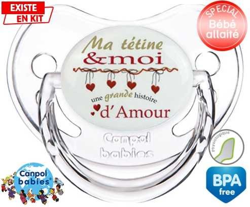 Tetine personnalisee pour bébé Ma sucette et moi une grande histoire d'amour à embout Physiologique en silicone de la marque Canpol Babies avec impression en en Couleurs de la collection Message.La silicone se reconnaît par sa couleur transparente. C'est une matière souple, douce, sans goût ni odeur et offre à bébé une succion plus facile grâce à sa souplesse.