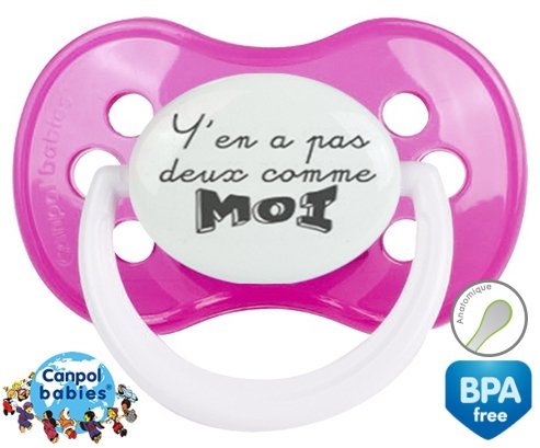 Sucette personnalisée pour bébé Y'en a pas deux comme moi : Sucette Anatomique en silicone de la marque Canpol Babies avec impression en gris.