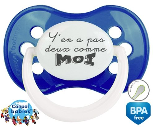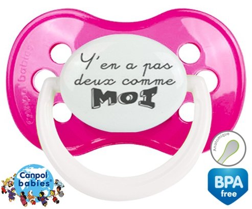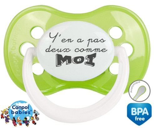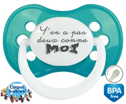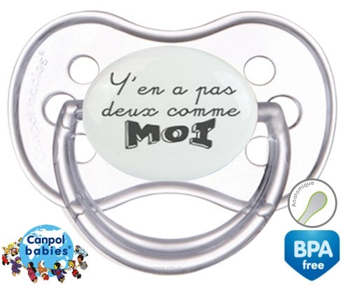 Sucette personnalisée pour bébé Y'en a pas deux comme moi à embout Anatomique en silicone de la marque Canpol Babies avec impression en en Gris de la collection Message.La silicone se reconnaît par sa couleur transparente. C'est une matière souple, douce, sans goût ni odeur et offre à bébé une succion plus facile grâce à sa souplesse.