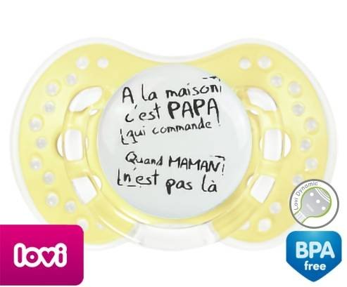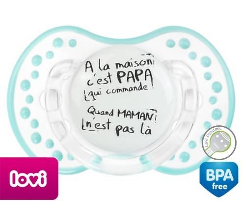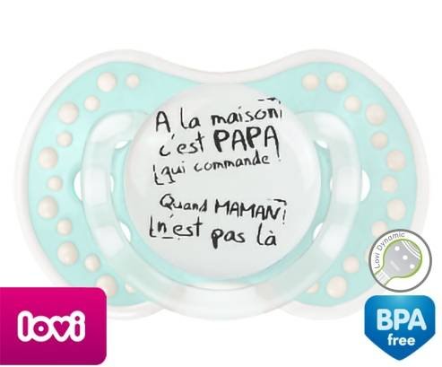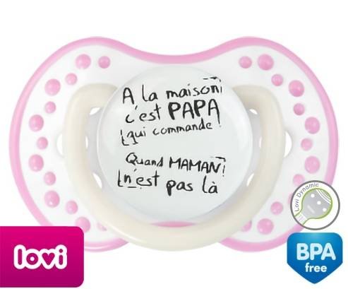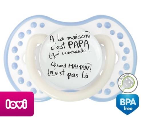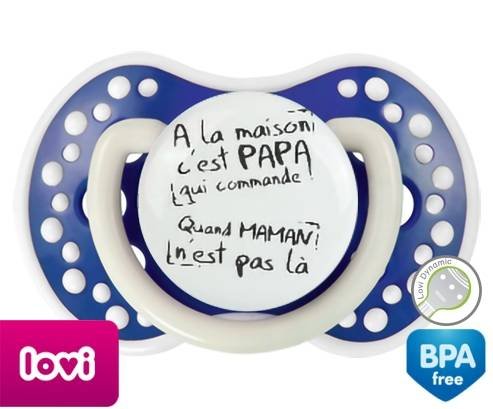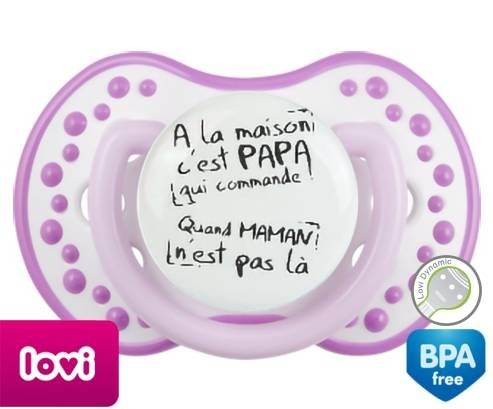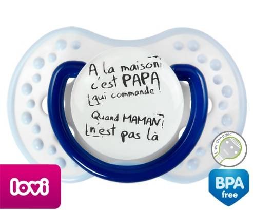 Sucette personnalisée pour bébé A la maison c'est papa qui commande... : Sucette LOVI Dynamicen silicone de la marque Lovi Dynamicavec impression en Gris.
