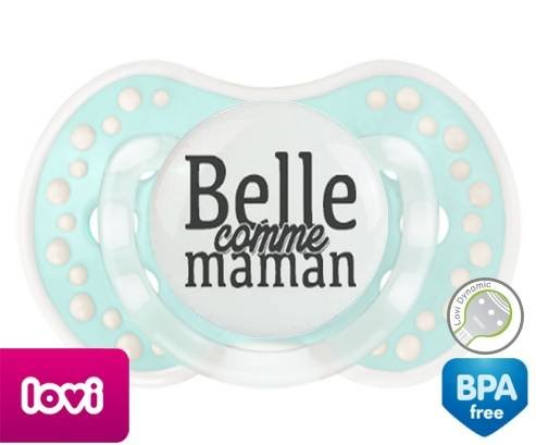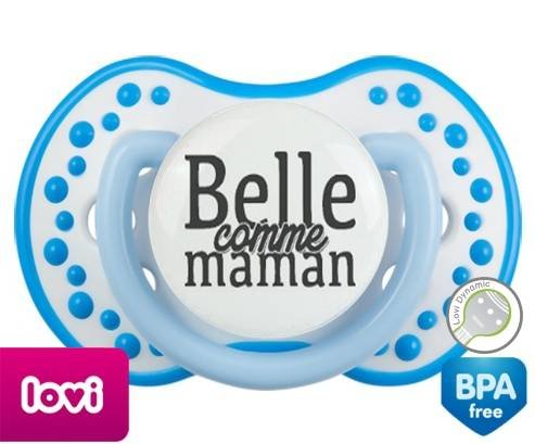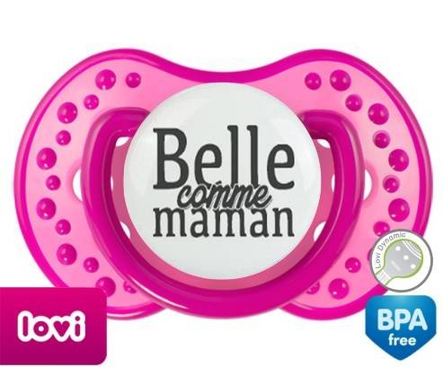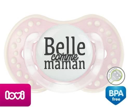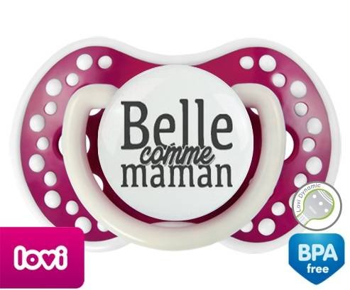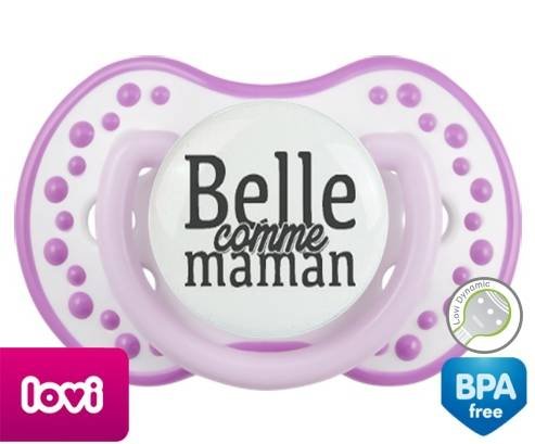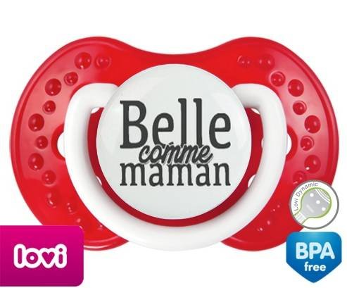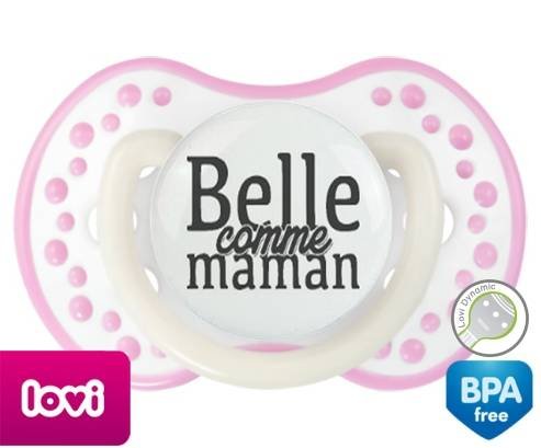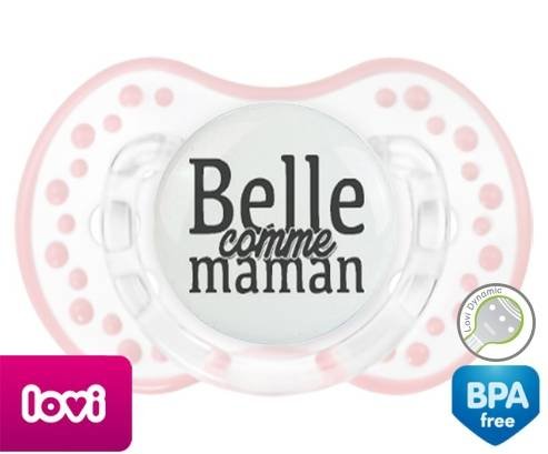 Tetine personnalisee pour bébé Belle comme maman style1 à embout LOVI Dynamic en silicone de la marque Lovi Dynamic avec impression en en Gris de la collection Papa / Maman.La silicone se reconnaît par sa couleur transparente. C'est une matière souple, douce, sans goût ni odeur et offre à bébé une succion plus facile grâce à sa souplesse.
