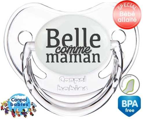 Sucette personnalisée pour bébé Belle comme maman style1 à embout Physiologique en silicone de la marque Canpol Babies avec impression en en Gris de la collection Papa / Maman.La silicone se reconnaît par sa couleur transparente. C'est une matière souple, douce, sans goût ni odeur et offre à bébé une succion plus facile grâce à sa souplesse.