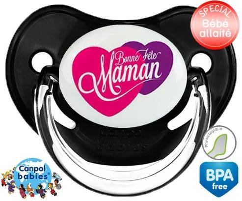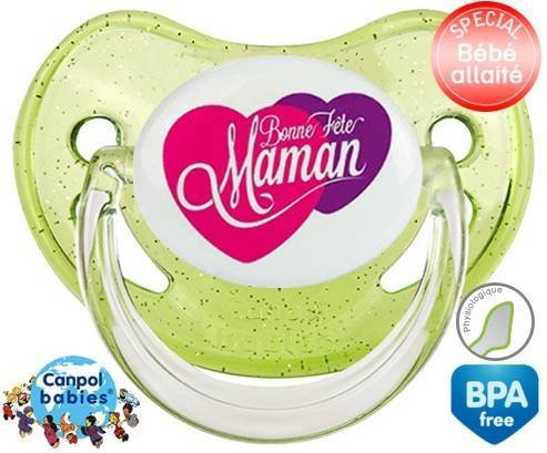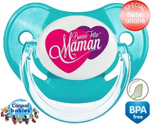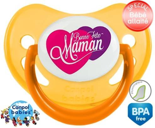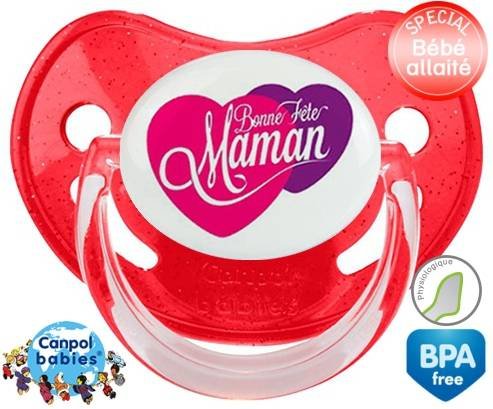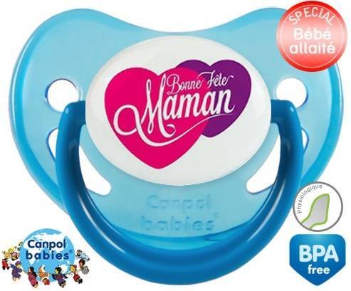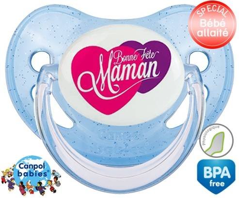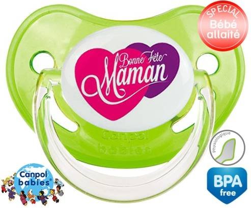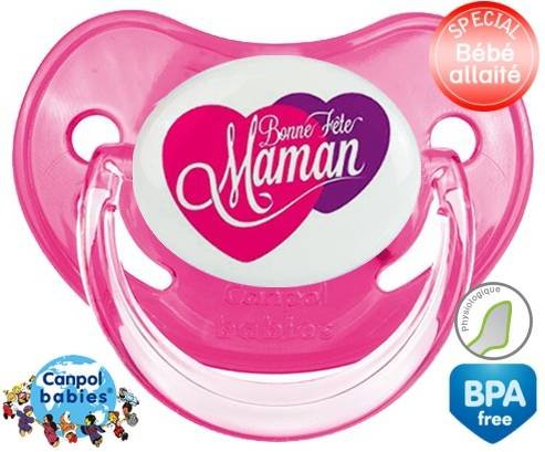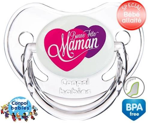 Sucette personnalisée pour bébé Bonne fête maman style10 à embout Physiologique en silicone de la marque Canpol Babies avec impression en en Couleurs de la collection Fête et Événement.La silicone se reconnaît par sa couleur transparente. C'est une matière souple, douce, sans goût ni odeur et offre à bébé une succion plus facile grâce à sa souplesse.