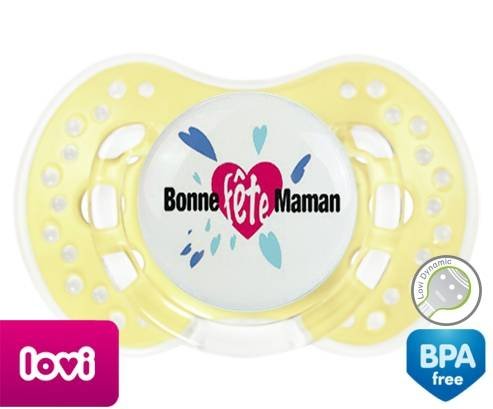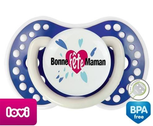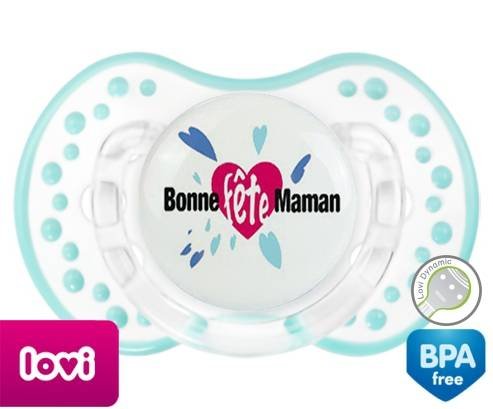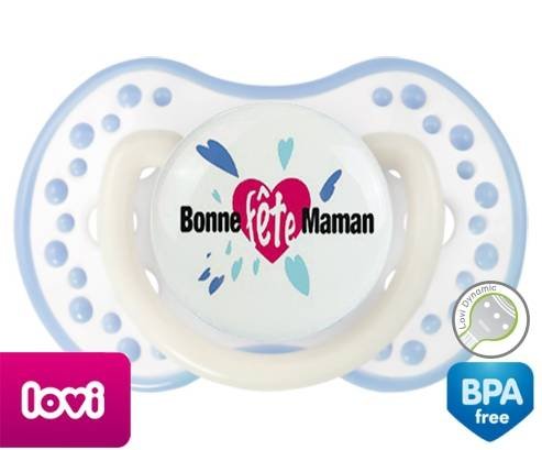 Sucette personnalisée pour bébé Bonne fête maman style16 à embout LOVI Dynamic en silicone de la marque Lovi Dynamic avec impression en en Couleurs de la collection Fête et Événement.La silicone se reconnaît par sa couleur transparente. C'est une matière souple, douce, sans goût ni odeur et offre à bébé une succion plus facile grâce à sa souplesse.