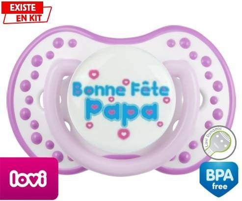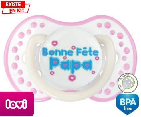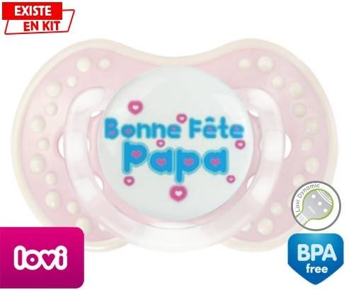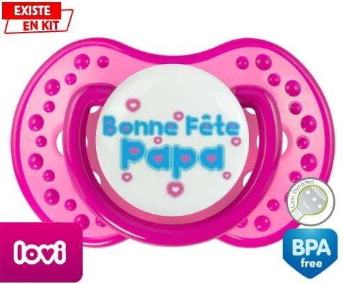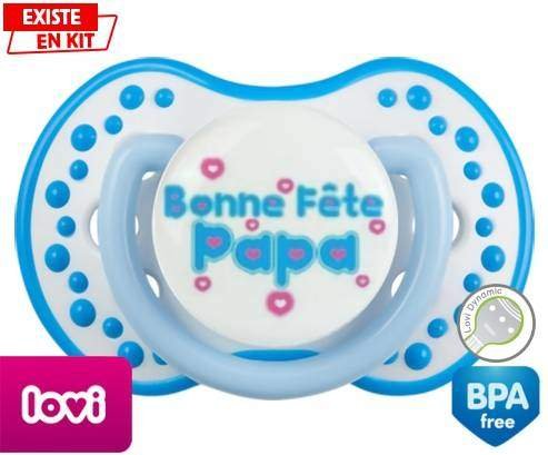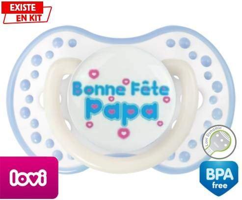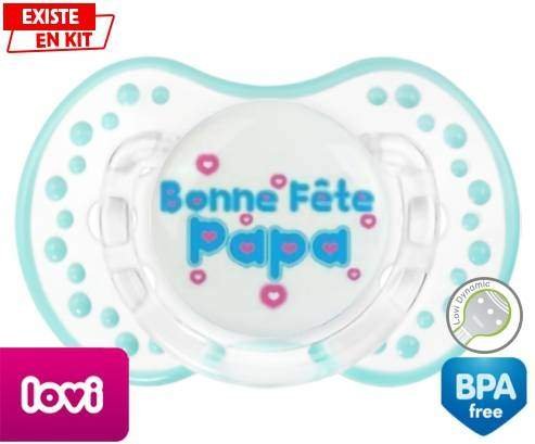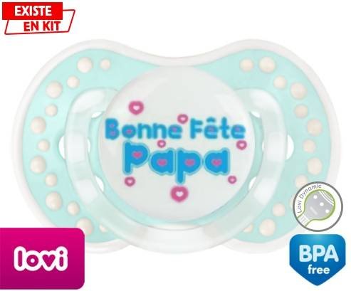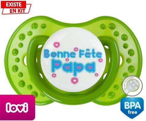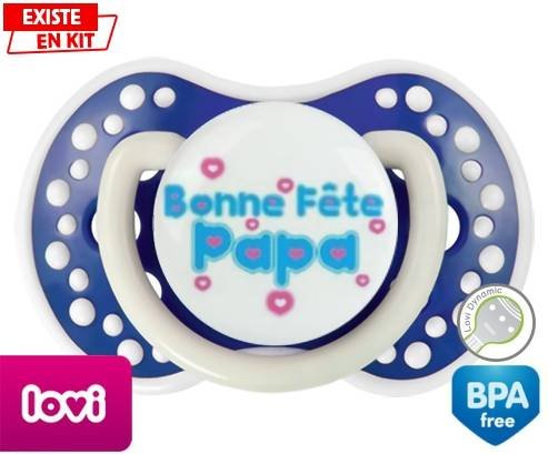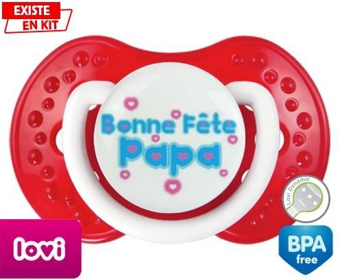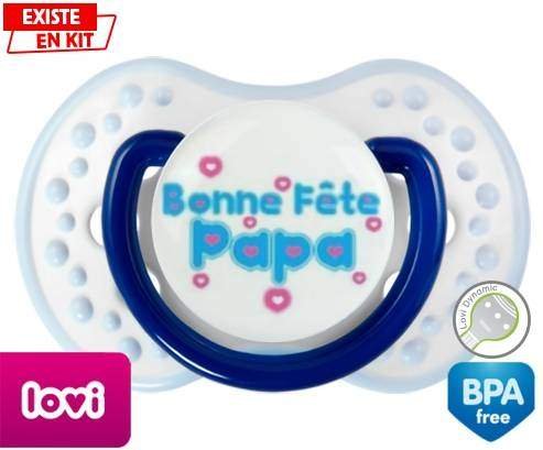 Sucette personnalisée pour bébé Bonne fête papa style1 à embout LOVI Dynamic en silicone de la marque Lovi Dynamic avec impression en en Couleurs de la collection Fête et Événement.La silicone se reconnaît par sa couleur transparente. C'est une matière souple, douce, sans goût ni odeur et offre à bébé une succion plus facile grâce à sa souplesse.