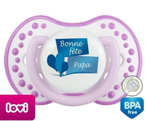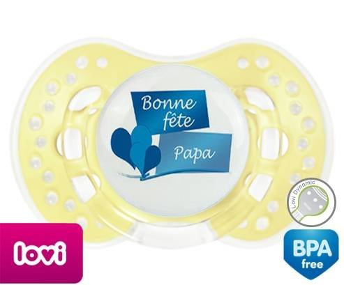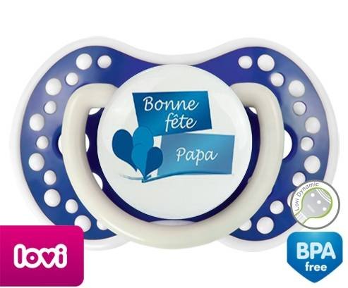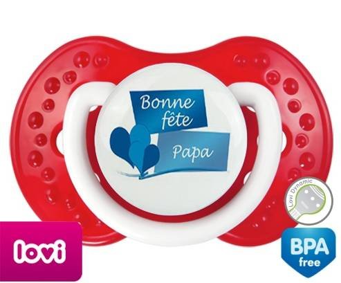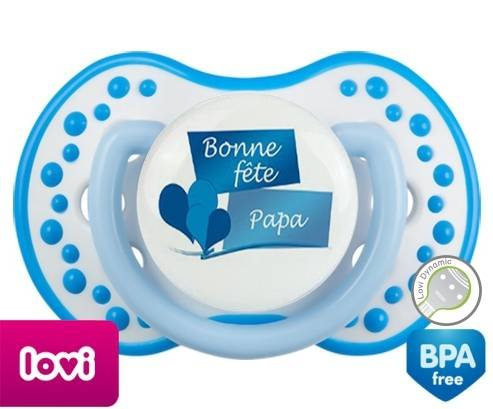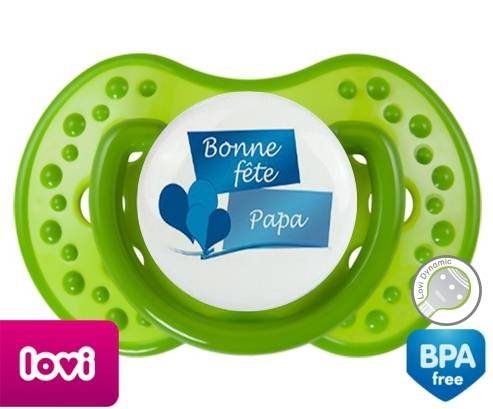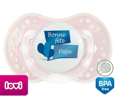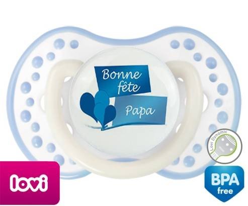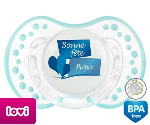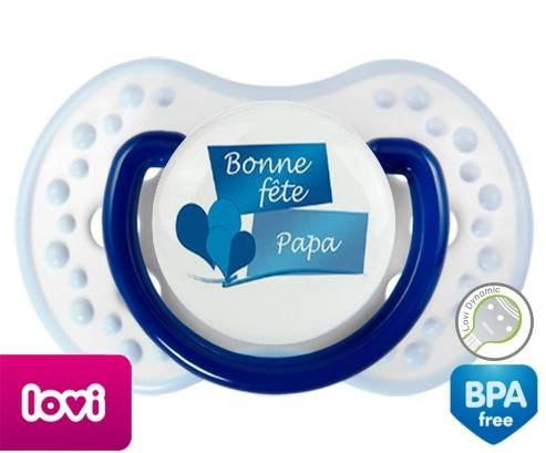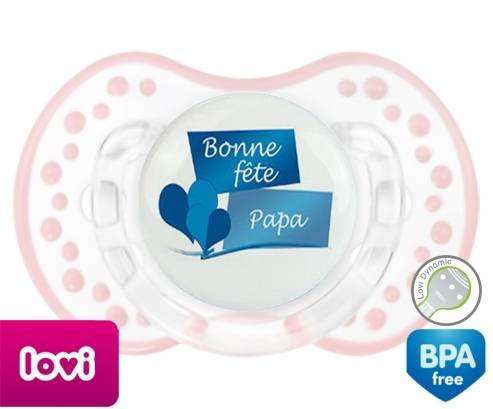 Sucette personnalisée pour bébé Bonne fête papa style11 à embout LOVI Dynamic en silicone de la marque Lovi Dynamic avec impression en en Couleurs de la collection Fête et Événement.La silicone se reconnaît par sa couleur transparente. C'est une matière souple, douce, sans goût ni odeur et offre à bébé une succion plus facile grâce à sa souplesse.