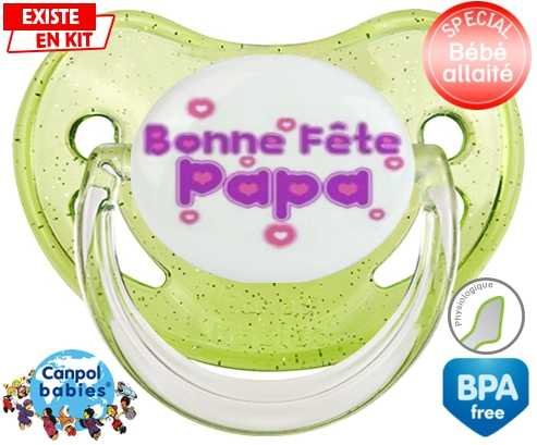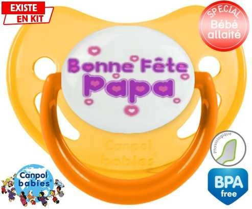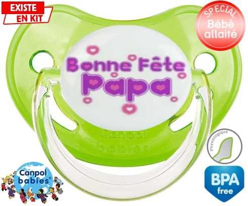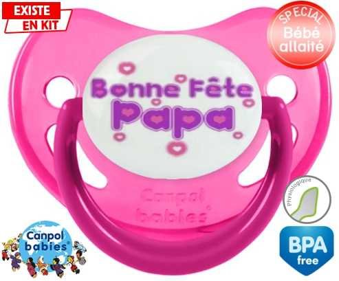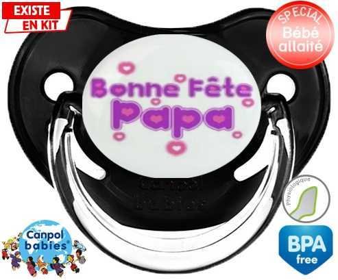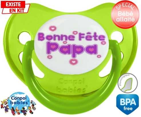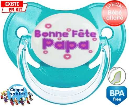Tétine personnalisée pour bébé Bonne fête papa style2 à embout Physiologique en silicone de la marque Canpol Babies avec impression en en Couleurs de la collection Fête et Événement.La silicone se reconnaît par sa couleur transparente. C'est une matière souple, douce, sans goût ni odeur et offre à bébé une succion plus facile grâce à sa souplesse.