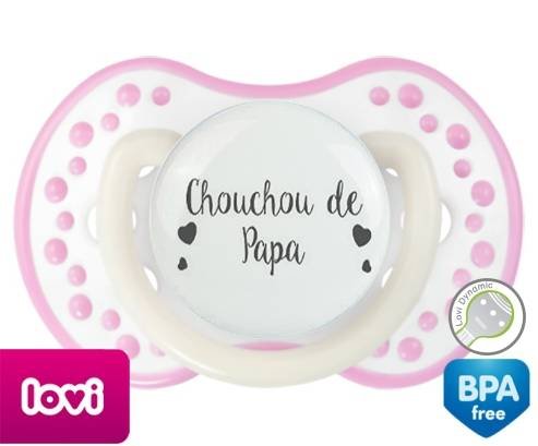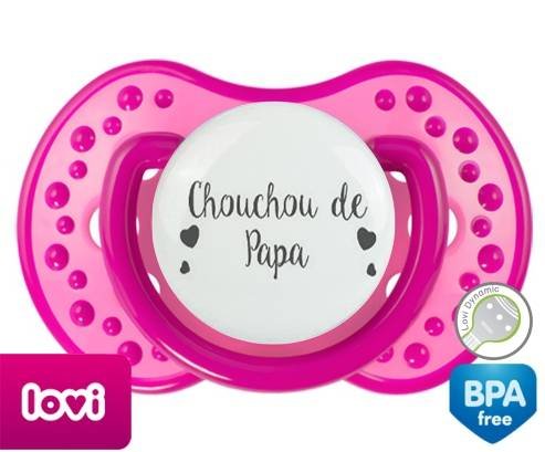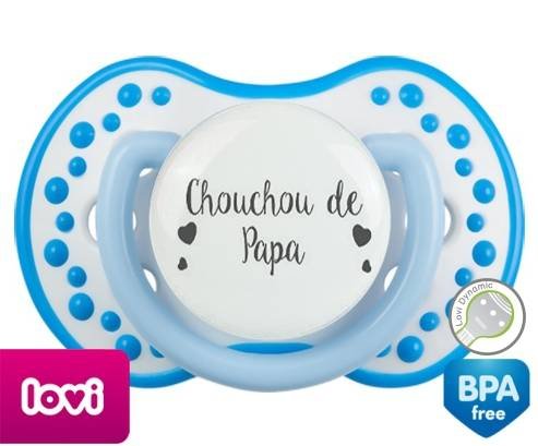Sucette personnalisée pour bébé Chouchou de papa à embout LOVI Dynamic en silicone de la marque Lovi Dynamic avec impression en en Gris de la collection Papa / Maman.La silicone se reconnaît par sa couleur transparente. C'est une matière souple, douce, sans goût ni odeur et offre à bébé une succion plus facile grâce à sa souplesse.