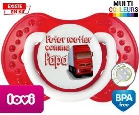 Tétine personnalisée pour bébé Futur routier comme papa à embout LOVI Dynamic en silicone de la marque Lovi Dynamic avec impression en en Couleurs de la collection Futur / Future.La silicone se reconnaît par sa couleur transparente. C'est une matière souple, douce, sans goût ni odeur et offre à bébé une succion plus facile grâce à sa souplesse.