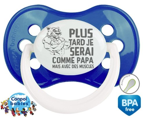 Sucette personnalisée pour bébé Humour plus tard je serai comme papa mais avec des muscles : Sucette Anatomique en silicone de la marque Canpol Babies avec impression en gris.