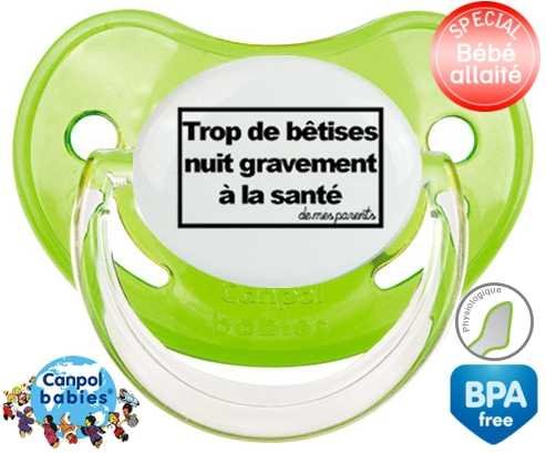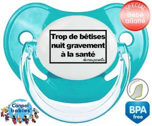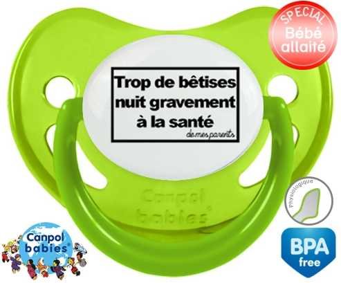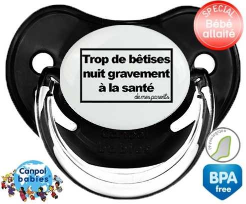 Sucette personnalisée pour bébé Personnalisée trop de bêtises nuit gravement à la santé de mes parents : Sucette Physiologique en silicone de la marque Canpol Babies avec impression en gris.