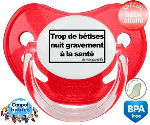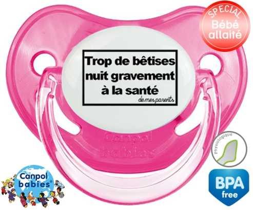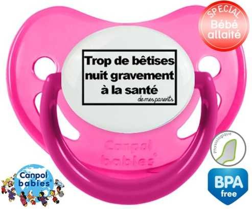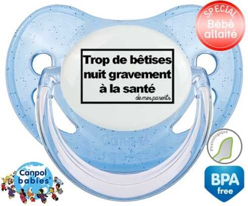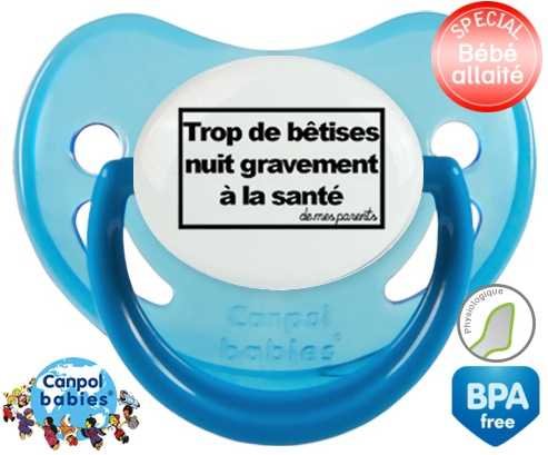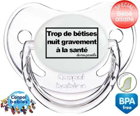 Sucette personnalisée pour bébé Personnalisée trop de bêtises nuit gravement à la santé de mes parents à embout Physiologique en silicone de la marque Canpol Babies avec impression en en Gris de la collection Humour 4 Saisons.La silicone se reconnaît par sa couleur transparente. C'est une matière souple, douce, sans goût ni odeur et offre à bébé une succion plus facile grâce à sa souplesse.