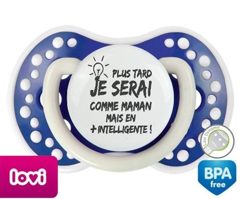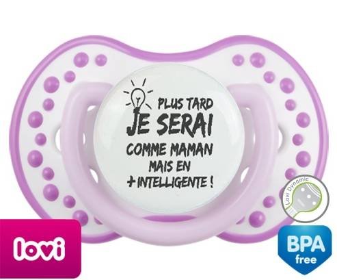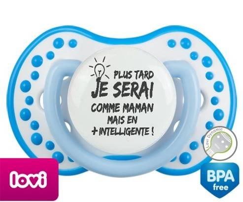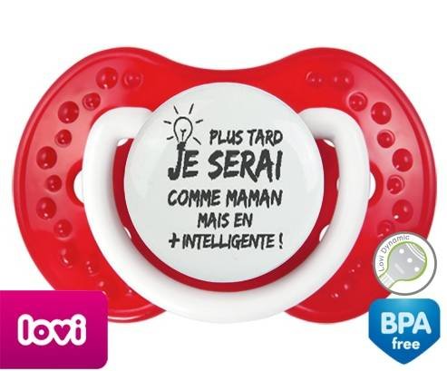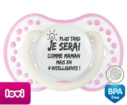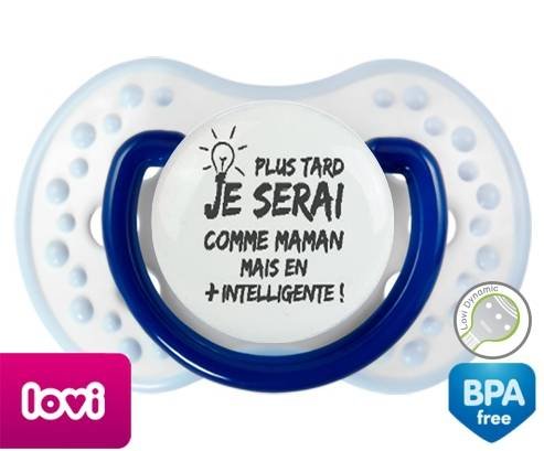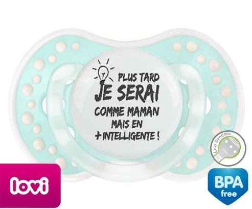 Sucette personnalisée pour bébé Plus tard je serai comme maman mais en plus intelligente à embout LOVI Dynamic en silicone de la marque Lovi Dynamic avec impression en en Gris de la collection Papa / Maman.La silicone se reconnaît par sa couleur transparente. C'est une matière souple, douce, sans goût ni odeur et offre à bébé une succion plus facile grâce à sa souplesse.