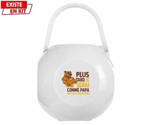Boîte à sucette avec design : Plus tard je serai comme papa mais avec des muscles style1 , impression de qualité et en couleur. Pratique : elle transporte la sucette en tout lieu. Grâce à sa poignée souple, elle est facile à accrocher à la poussette, sac à langer ... Cette boîte de rangement flexible, est la solution hygiénique pour protéger les sucettes de son enfant quand il ne les utilise pas. Peut contenir jusqu'à deux sucettes.