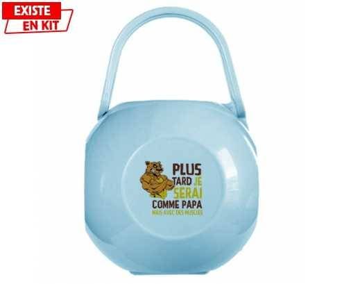 Boîte à sucette personnalisée : Plus tard je serai comme papa mais avec des muscles style1 , avec une impression en couleur et qui compléte toute la gamme ( sucette, attache-sucette, bavoir, chausson, body et bonnet).