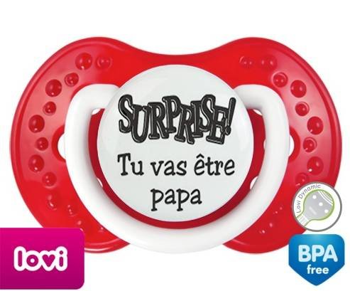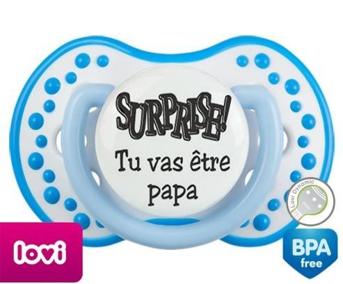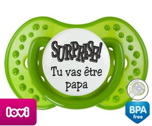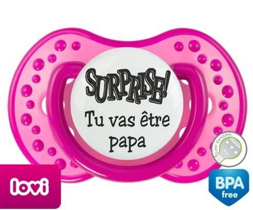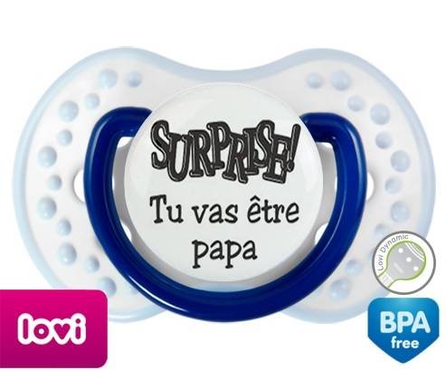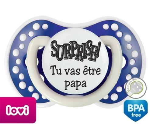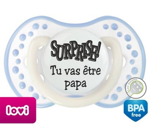 Sucette personnalisée pour bébé Surprise tu vas être papa à embout LOVI Dynamic en silicone de la marque Lovi Dynamic avec impression en en Gris de la collection Papa / Maman.La silicone se reconnaît par sa couleur transparente. C'est une matière souple, douce, sans goût ni odeur et offre à bébé une succion plus facile grâce à sa souplesse.