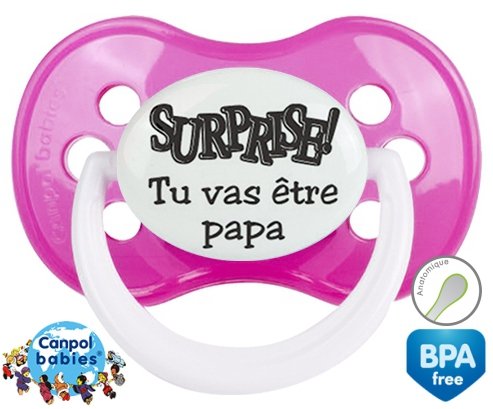 Tétine personnalisée pour bébé Surprise tu vas être papa : Tétine Anatomique en silicone de la marque Canpol Babies avec impression en gris.