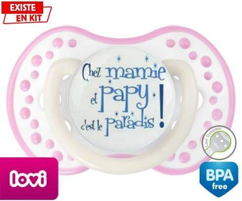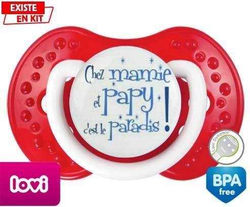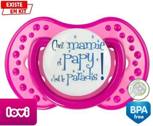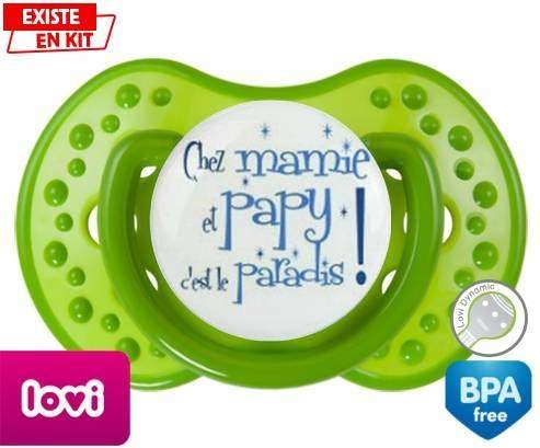 Sucette personnalisée pour bébé Chez mamie et papy c'est le paradis style1 : Sucette LOVI Dynamic en silicone de la marque Lovi Dynamic avec impression en Couleur.