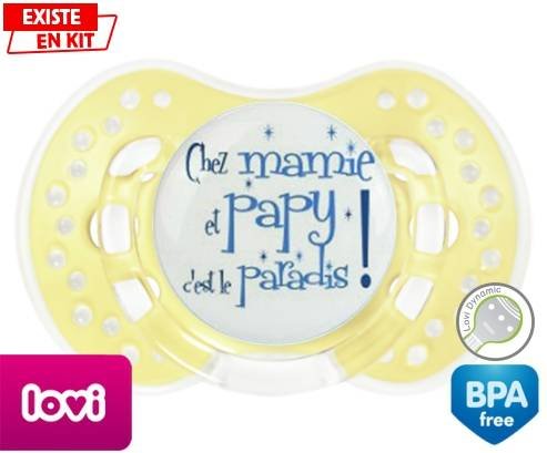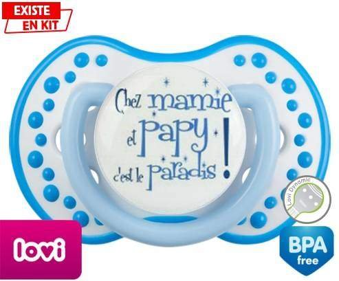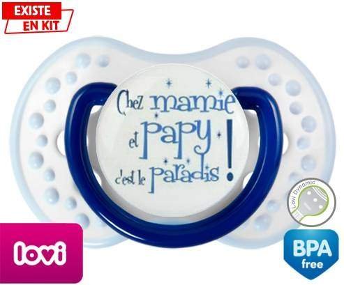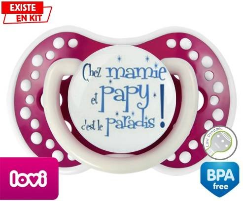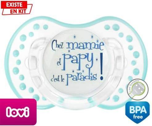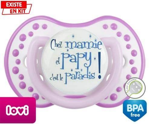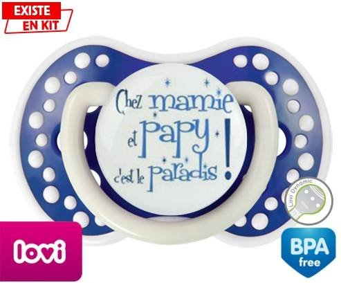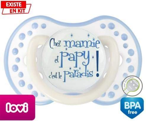 Sucette personnalisée pour bébé Chez mamie et papy c'est le paradis style1 à embout LOVI Dynamic en silicone de la marque Lovi Dynamic avec impression en en Couleurs de la collection Papi / Mamie.La silicone se reconnaît par sa couleur transparente. C'est une matière souple, douce, sans goût ni odeur et offre à bébé une succion plus facile grâce à sa souplesse.