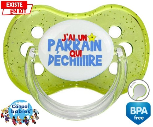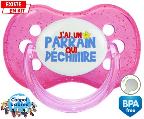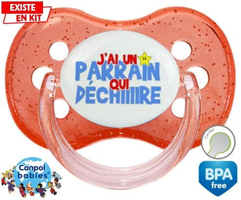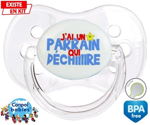 Tétine personnalisée pour bébé J'ai un parrain qui déchire style1 à embout Cerise en silicone de la marque Canpol Babies avec impression en en Couleurs de la collection Parrain / Marraine.La silicone se reconnaît par sa couleur transparente. C'est une matière souple, douce, sans goût ni odeur et offre à bébé une succion plus facile grâce à sa souplesse.