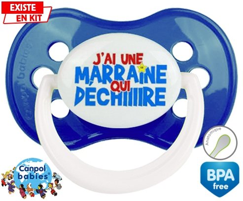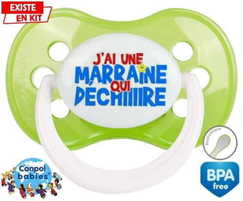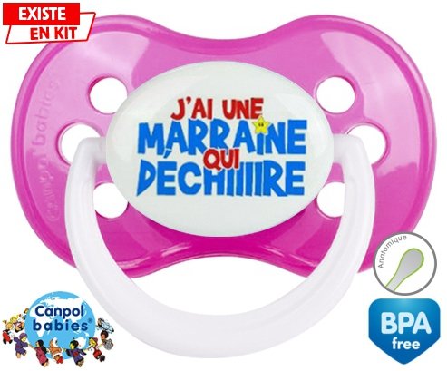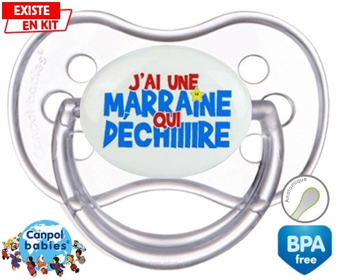 Sucette personnalisée pour bébé J'ai une marraine qui déchire style1 à embout Anatomique en silicone de la marque Canpol Babies avec impression en en Couleurs de la collection Parrain / Marraine.La silicone se reconnaît par sa couleur transparente. C'est une matière souple, douce, sans goût ni odeur et offre à bébé une succion plus facile grâce à sa souplesse.