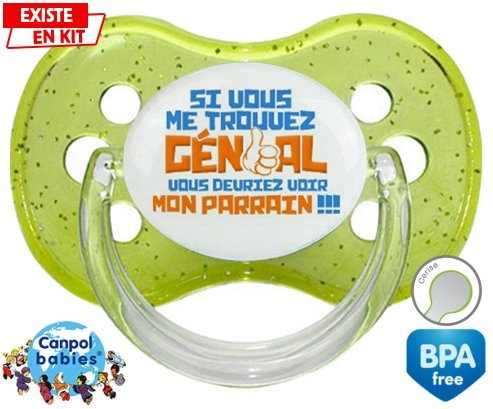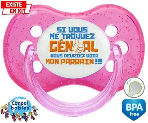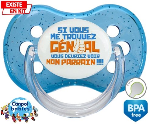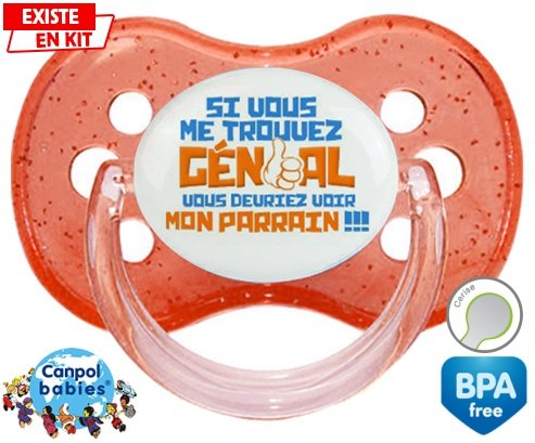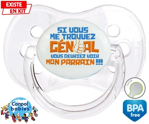 Sucette personnalisée pour bébé Si vous me trouvez génial, vous devriez voir mon parrain! à embout Cerise en silicone de la marque Canpol Babies avec impression en en Couleurs de la collection Parrain / Marraine.La silicone se reconnaît par sa couleur transparente. C'est une matière souple, douce, sans goût ni odeur et offre à bébé une succion plus facile grâce à sa souplesse.