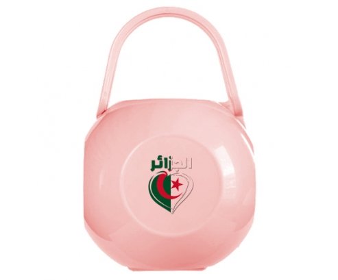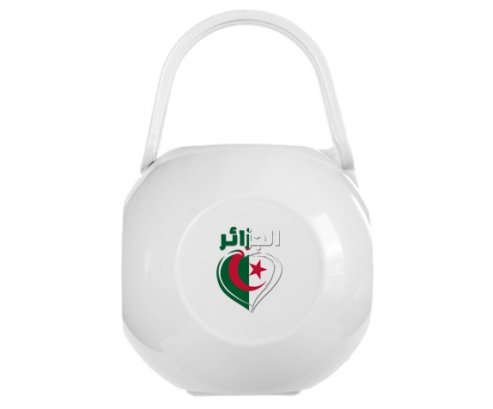 Boîte à sucette avec design : Algérie en arabe + cœur , impression de qualité et en couleur. Pratique : elle transporte la sucette en tout lieu. Grâce à sa poignée souple, elle est facile à accrocher à la poussette, sac à langer ... Cette boîte de rangement flexible, est la solution hygiénique pour protéger les sucettes de son enfant quand il ne les utilise pas. Peut contenir jusqu'à deux sucettes.