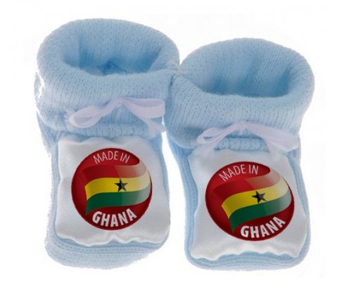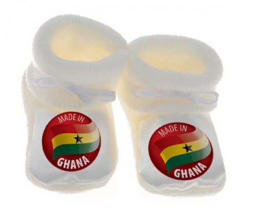Su7.fr vous propose le chausson bébé personnalisé pour nouveau né avec le design : Made in GHANA . Ce chausson avec une impression en couleur compléte toute la gamme ( sucette, attache-sucette, bavoir, chausson, body , Boîte à sucette, et bonnet).