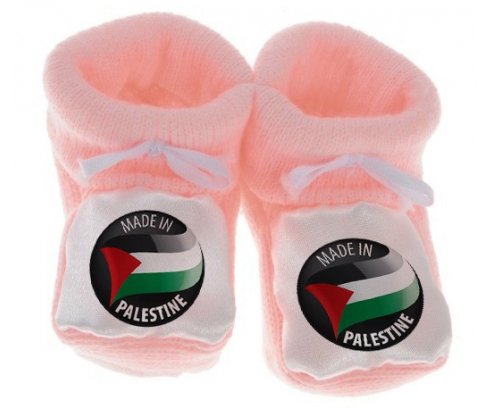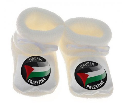 Su7.fr vous propose le chausson bébé personnalisé pour nouveau né avec le design : Made in PALESTINE . Ce chausson avec une impression en couleur compléte toute la gamme ( sucette, attache-sucette, bavoir, chausson, body , Boîte à sucette, et bonnet).