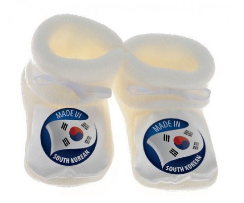 Chausson personnalisé pour bébé avec le design : Made in SOUTH KOREAN , pour le nouveau né de 0 à 1 mois. Ce chausson est le cadeau idéal , surtout, personnalisé, vous fera craquer tout simplement. D'une extrême douceur et très beaux, il est aussi parfait pour réchauffer les pieds de votre bébé. Pratiques et confortables, il s'enfile comme des chaussettes et il est fait en coton (semelle) - polyester (dessus) - acrylique (revers).