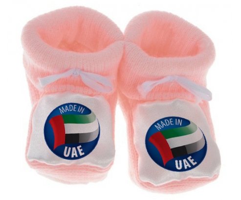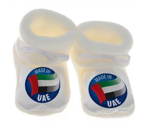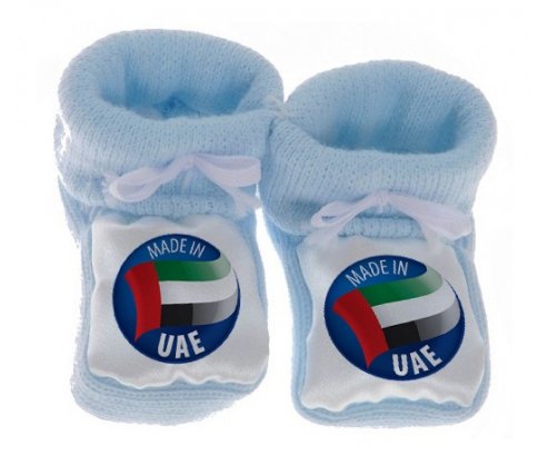 Su7.fr vous propose le chausson bébé personnalisé pour nouveau né avec le design : Made in UAE . Ce chausson avec une impression en couleur compléte toute la gamme ( sucette, attache-sucette, bavoir, chausson, body , Boîte à sucette, et bonnet).