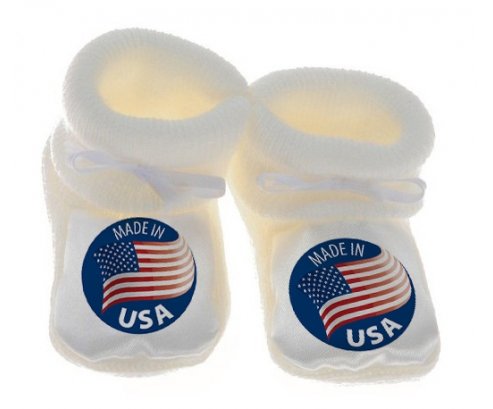 Su7.fr vous propose le chausson bébé personnalisé pour nouveau né avec le design : Made in USA . Ce chausson avec une impression en couleur compléte toute la gamme ( sucette, attache-sucette, bavoir, chausson, body , Boîte à sucette, et bonnet).