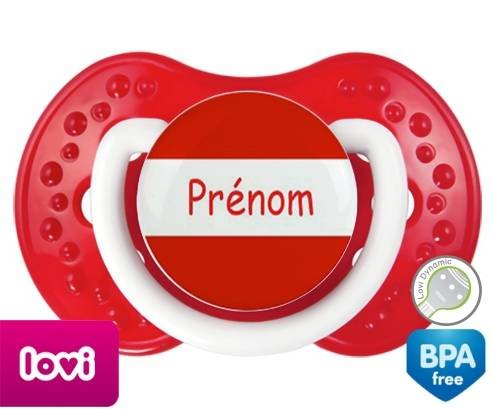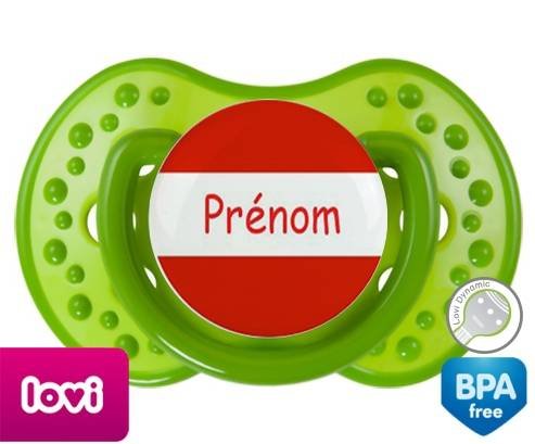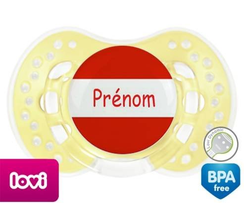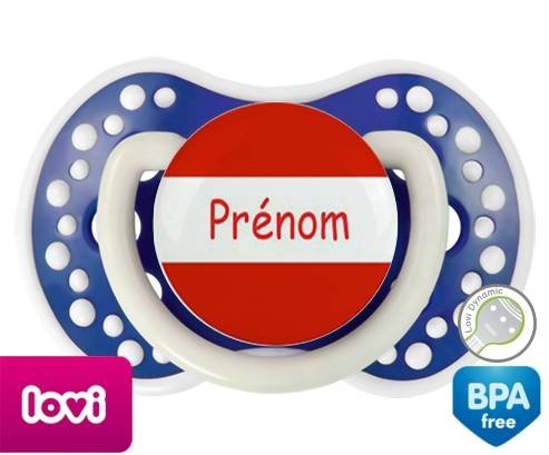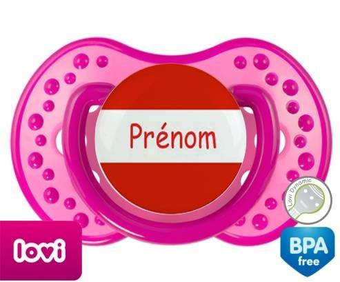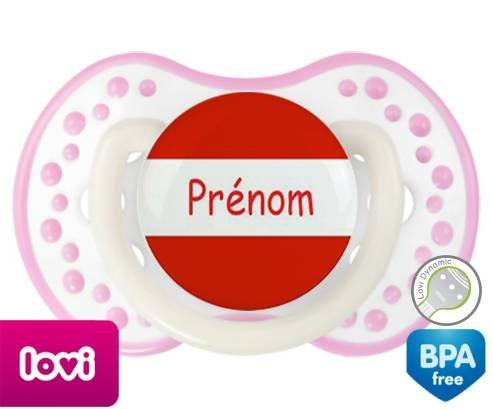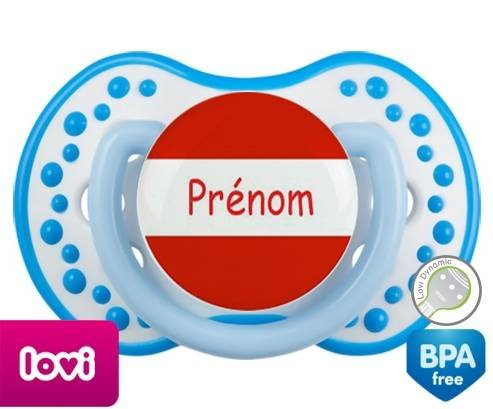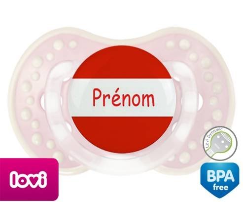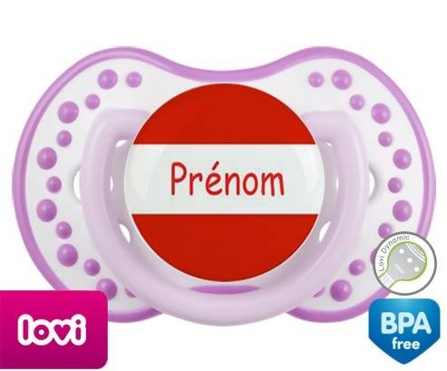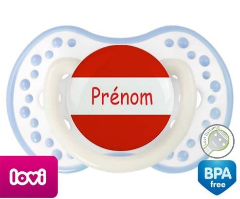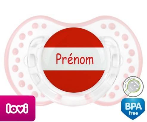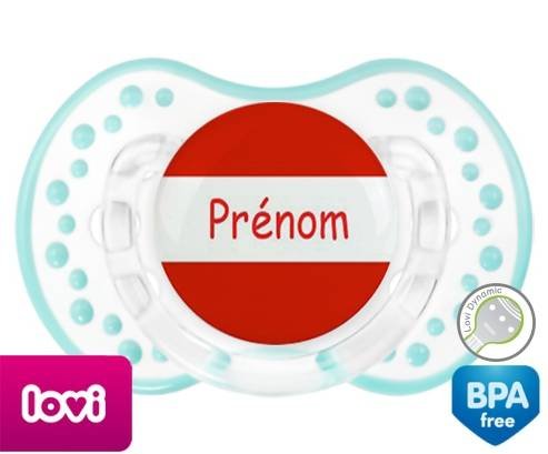 Tetine personnalisee pour bébé Drapeau autriche + prénom à embout LOVI Dynamic en silicone de la marque Lovi Dynamic avec impression en en Couleurs de la collection Prénom personnalisé.La silicone se reconnaît par sa couleur transparente. C'est une matière souple, douce, sans goût ni odeur et offre à bébé une succion plus facile grâce à sa souplesse.