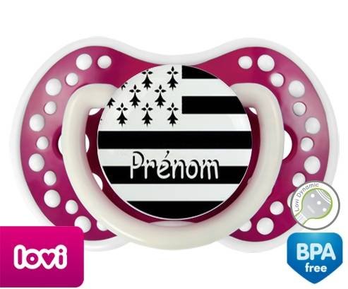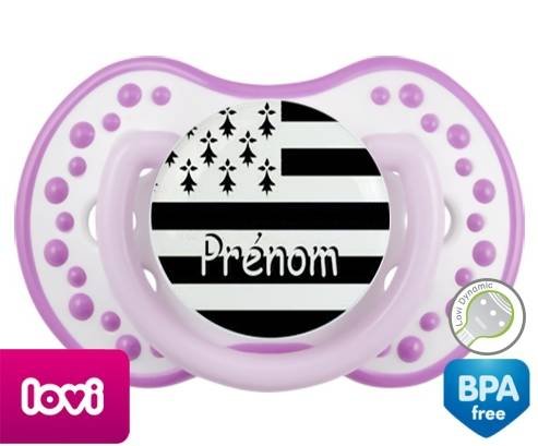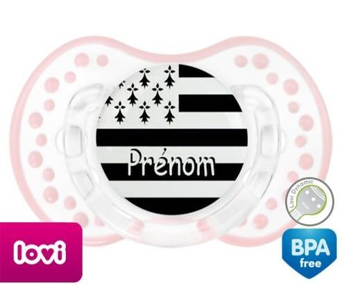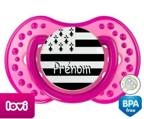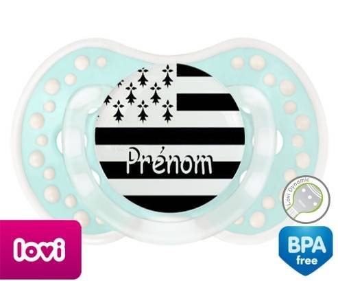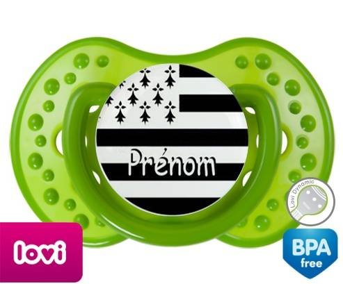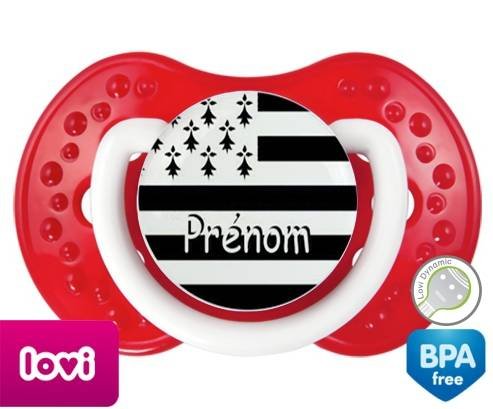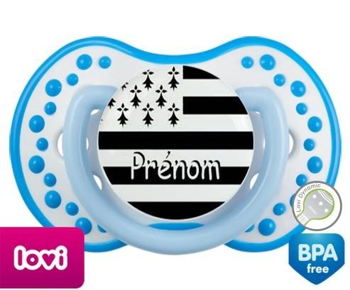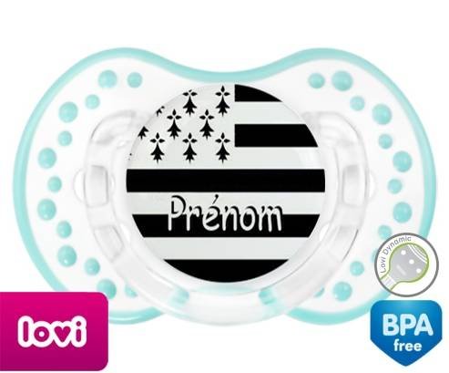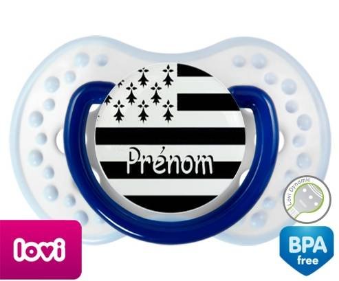 Sucette personnalisée pour bébé Drapeau bretagne + prénom à embout LOVI Dynamic en silicone de la marque Lovi Dynamic avec impression en en Couleurs de la collection Prénom personnalisé.La silicone se reconnaît par sa couleur transparente. C'est une matière souple, douce, sans goût ni odeur et offre à bébé une succion plus facile grâce à sa souplesse.
