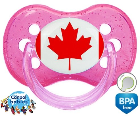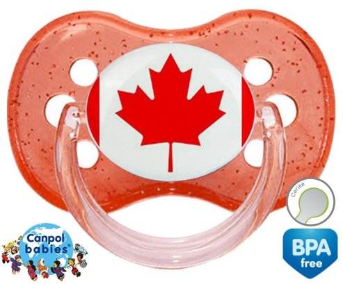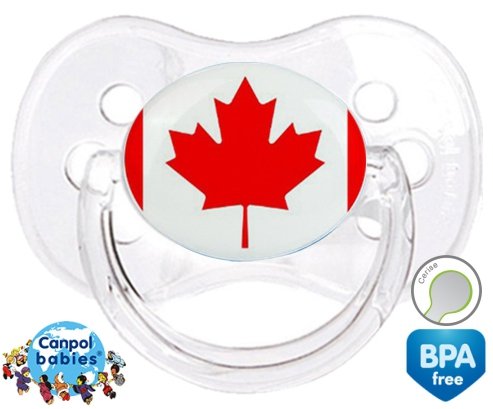 Sucette personnalisée pour bébé Drapeau canada à embout Cerise en silicone de la marque Canpol Babies avec impression en en Couleurs de la collection Pays / Région.La silicone se reconnaît par sa couleur transparente. C'est une matière souple, douce, sans goût ni odeur et offre à bébé une succion plus facile grâce à sa souplesse.