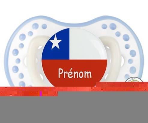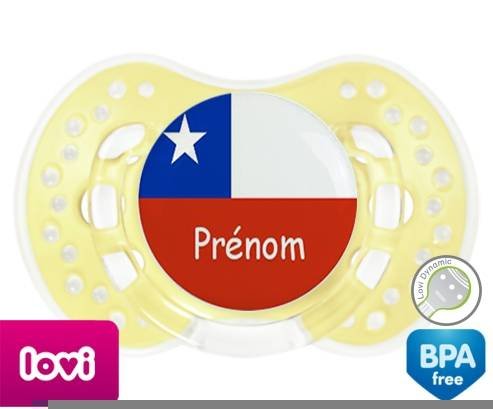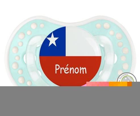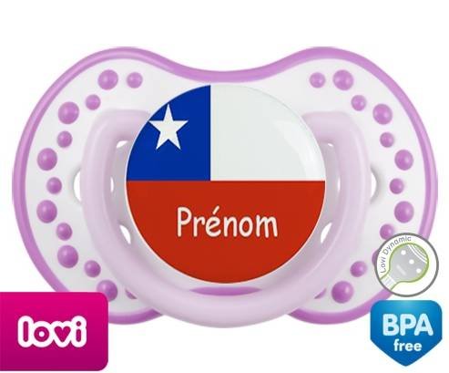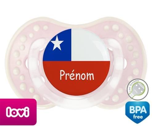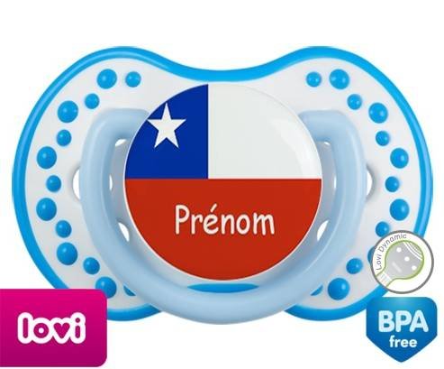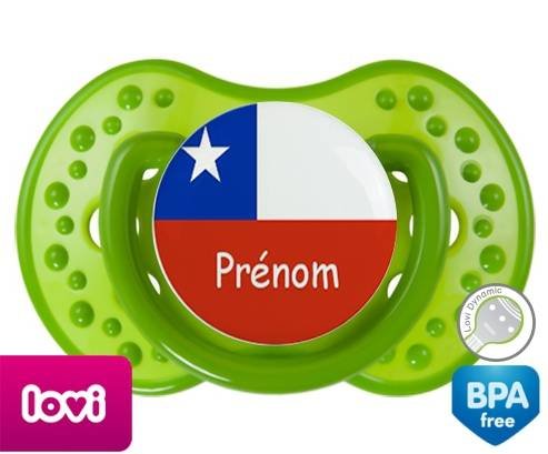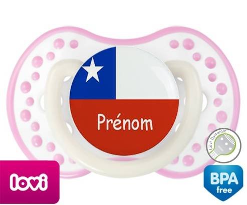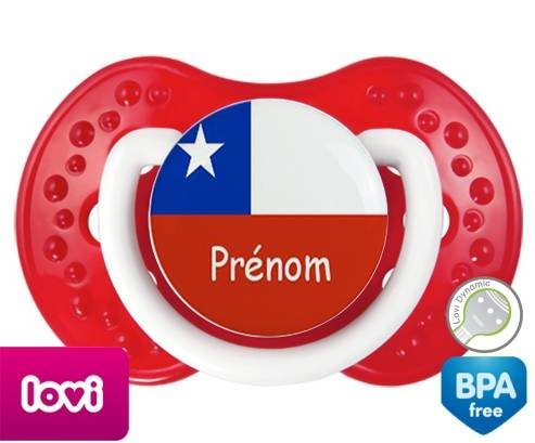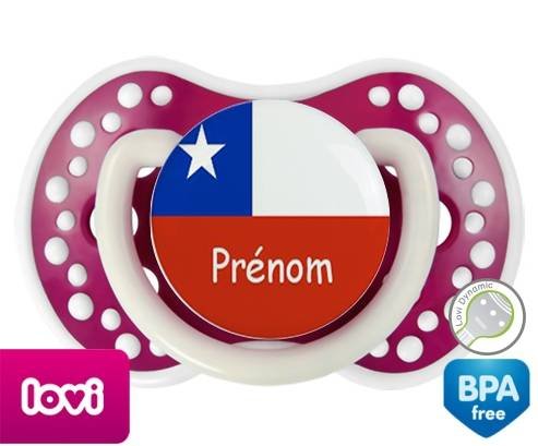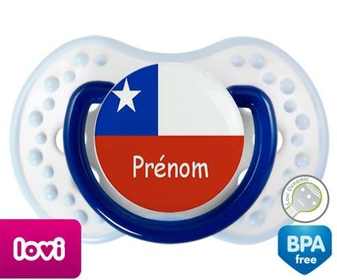 Sucette personnalisée pour bébé Drapeau chili + prénom à embout LOVI Dynamic en silicone de la marque Lovi Dynamic avec impression en en Couleurs de la collection Prénom personnalisé.La silicone se reconnaît par sa couleur transparente. C'est une matière souple, douce, sans goût ni odeur et offre à bébé une succion plus facile grâce à sa souplesse.