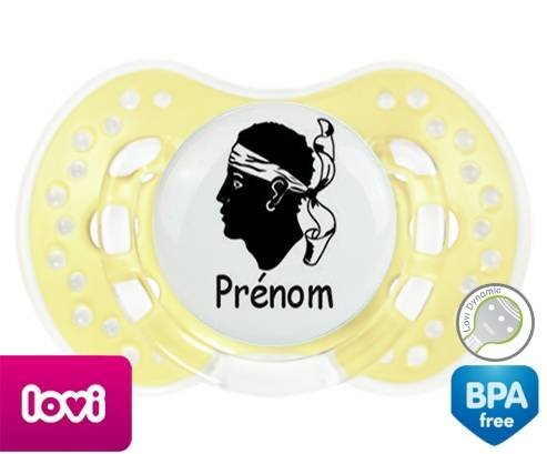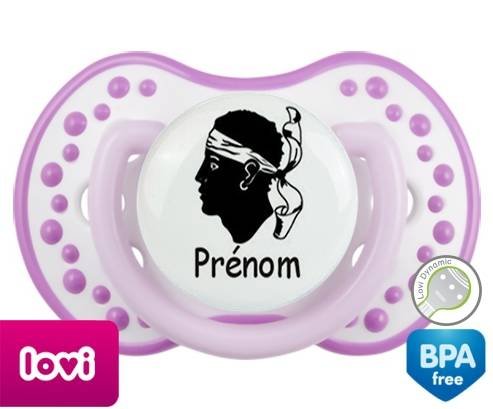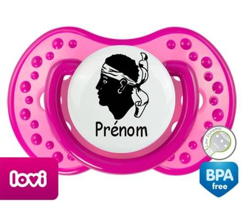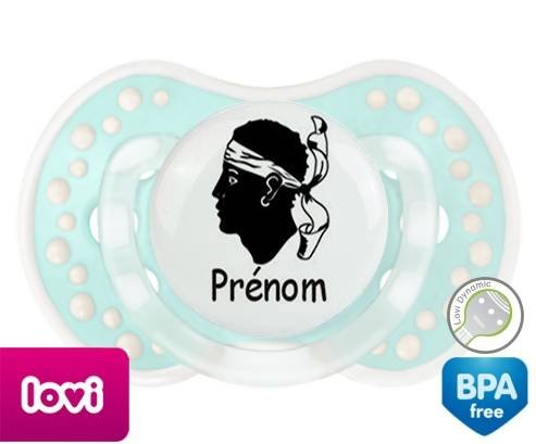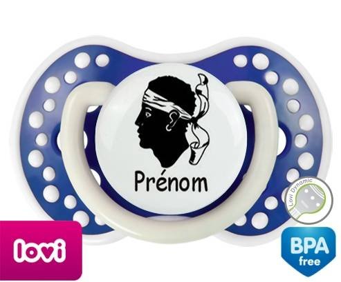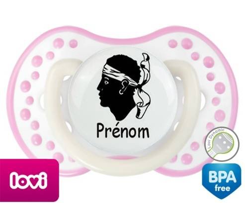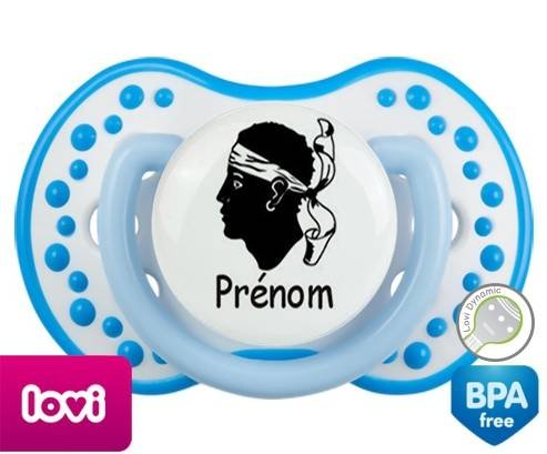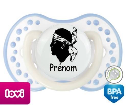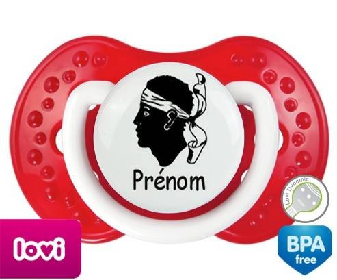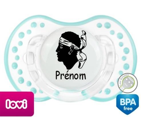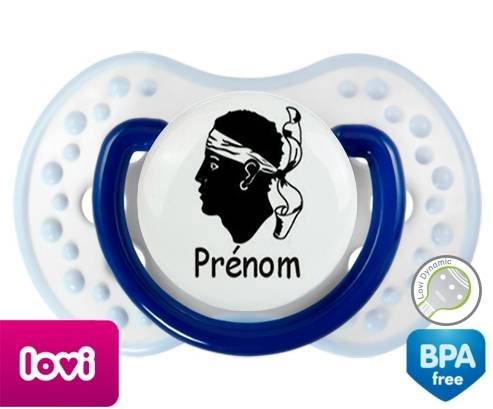 Sucette personnalisée pour bébé Drapeau corse + prénom à embout LOVI Dynamic en silicone de la marque Lovi Dynamic avec impression en en Couleurs de la collection Prénom personnalisé.La silicone se reconnaît par sa couleur transparente. C'est une matière souple, douce, sans goût ni odeur et offre à bébé une succion plus facile grâce à sa souplesse.