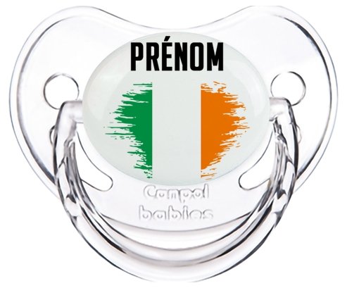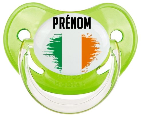 Sucette personnalisée pour bébé Drapeau effet pinceau Irlande avec prénom à embout Physiologique en silicone de la marque Canpol Babies avec impression en en Couleurs de la Collection Pays / Équipes .La silicone se reconnaît par sa couleur transparente. C'est une matière souple, douce, sans goût ni odeur et offre à bébé une succion plus facile grâce à sa souplesse.