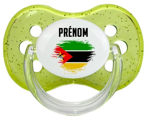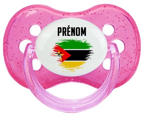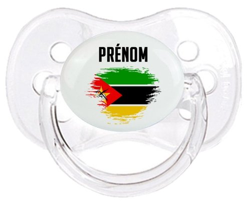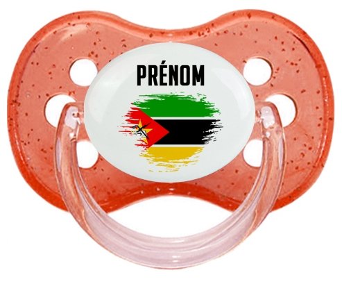 Sucette personnalisée pour bébé Drapeau effet pinceau Mozambique avec prénom à embout Cerise en silicone de la marque Canpol Babies avec impression en en Couleurs de la Collection Pays / Équipes .La silicone se reconnaît par sa couleur transparente. C'est une matière souple, douce, sans goût ni odeur et offre à bébé une succion plus facile grâce à sa souplesse.