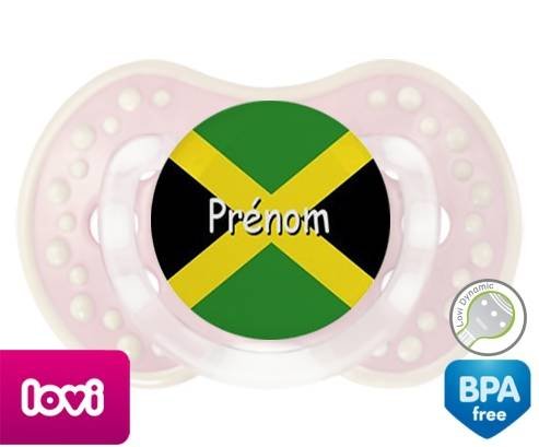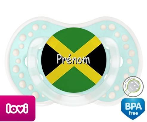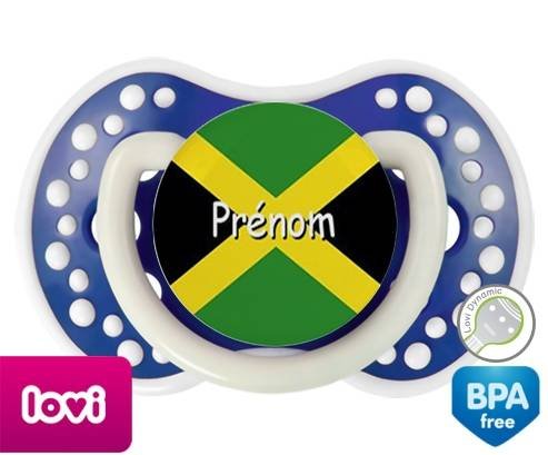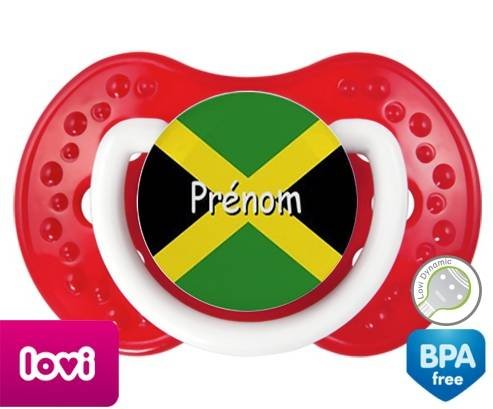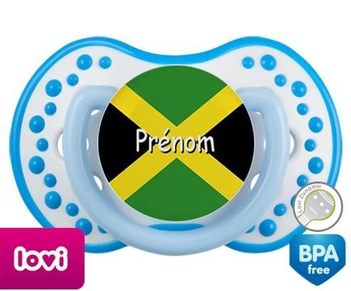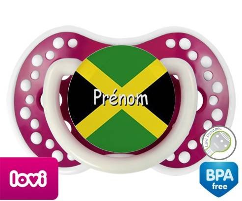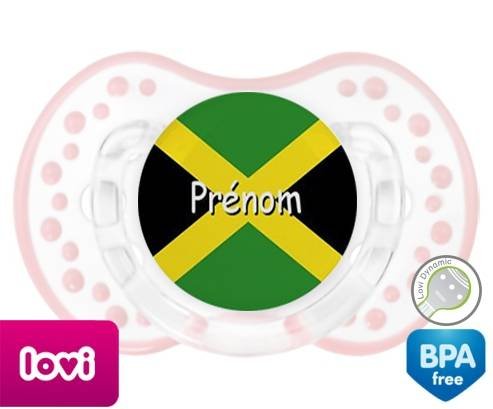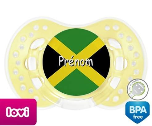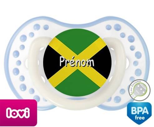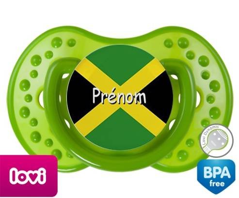 Sucette personnalisée pour bébé Drapeau jamaïque + prénom à embout LOVI Dynamic en silicone de la marque Lovi Dynamic avec impression en en Couleurs de la collection Prénom personnalisé.La silicone se reconnaît par sa couleur transparente. C'est une matière souple, douce, sans goût ni odeur et offre à bébé une succion plus facile grâce à sa souplesse.