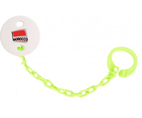 Attache-tetine personnalisé Flag Morocco design 1 avec personnalisation design en couleur. Disponible en plusieurs coloris et plastique facile à laver. Pratique : permet une fixation facile de la sucette de bébé à son doudou et à ses vêtements en un seul clip. Hygiénique : empêche la sucette de tomber par terre et permet ainsi à bébé d'avoir une sucette propre toute la journée Visible : facile à repérer grâce aux motifs colorés.