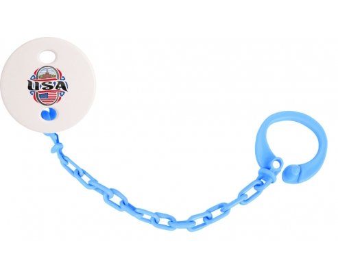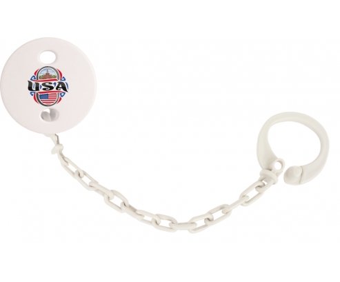 Attache-sucette personnalisé Flag USA avec personnalisation design en couleur. Disponible en plusieurs coloris et plastique facile à laver. Pratique : permet une fixation facile de la sucette de bébé à son doudou et à ses vêtements en un seul clip. Hygiénique : empêche la sucette de tomber par terre et permet ainsi à bébé d'avoir une sucette propre toute la journée Visible : facile à repérer grâce aux motifs colorés.