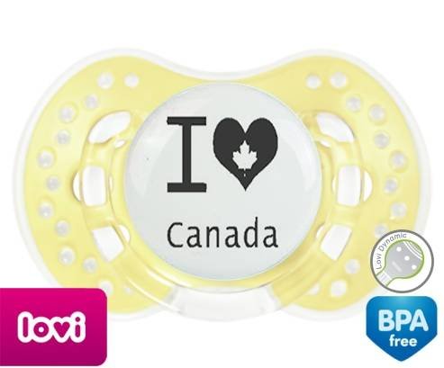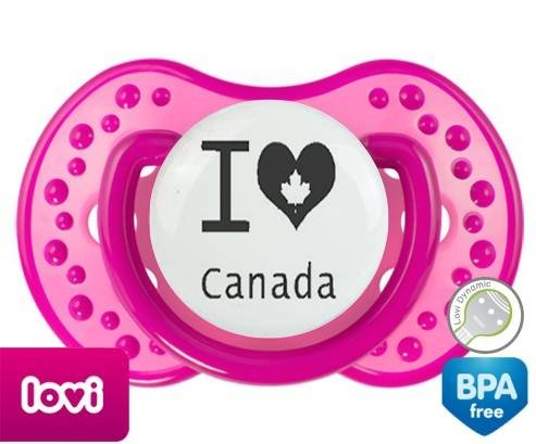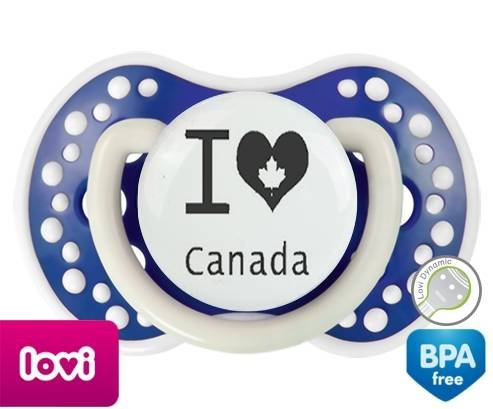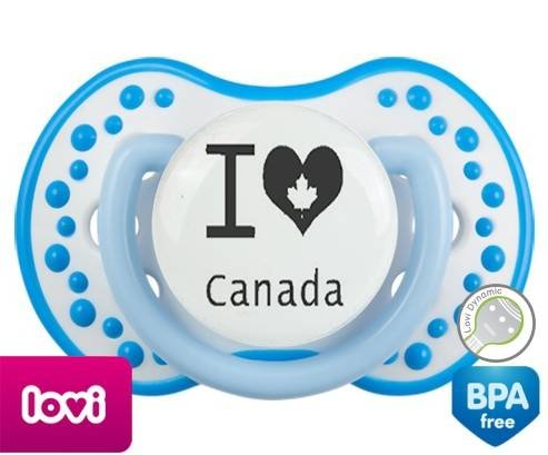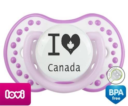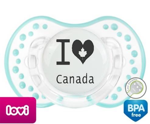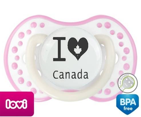 Tétine personnalisée pour bébé I love canada à embout LOVI Dynamic en silicone de la marque Lovi Dynamic avec impression en en Gris de la collection I love / I like.La silicone se reconnaît par sa couleur transparente. C'est une matière souple, douce, sans goût ni odeur et offre à bébé une succion plus facile grâce à sa souplesse.