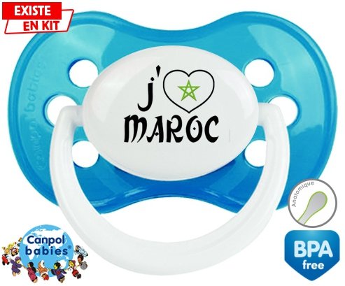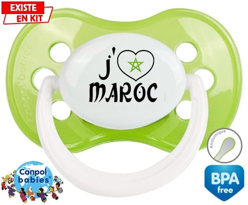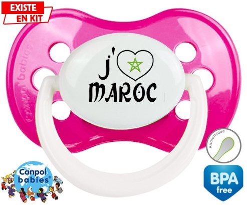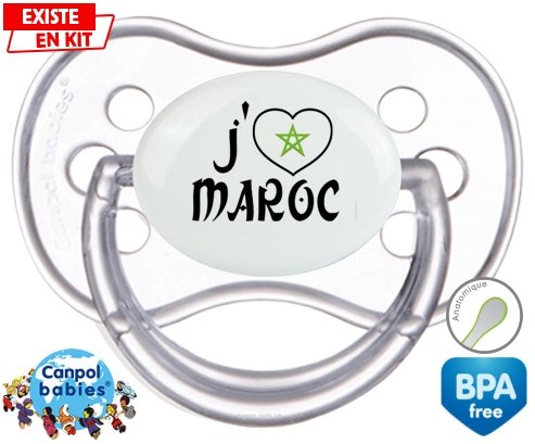 Sucette personnalisée pour bébé J'aime Maroc à embout Anatomique en silicone de la marque Canpol Babies avec impression en en Couleurs de la collection Pays / Région.La silicone se reconnaît par sa couleur transparente. C'est une matière souple, douce, sans goût ni odeur et offre à bébé une succion plus facile grâce à sa souplesse.