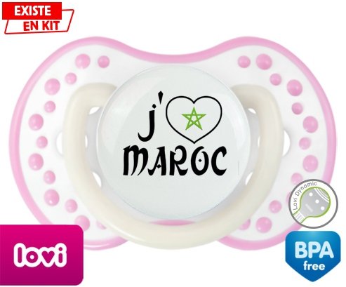 Tétine personnalisée pour bébé J'aime Maroc à embout LOVI Dynamic en silicone de la marque Lovi Dynamic avec impression en en Couleurs de la collection Pays / Région.La silicone se reconnaît par sa couleur transparente. C'est une matière souple, douce, sans goût ni odeur et offre à bébé une succion plus facile grâce à sa souplesse.