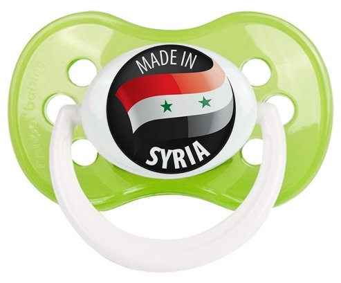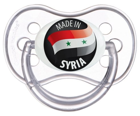 Tétine personnalisée pour bébé Made in SYRIA à embout Anatomique en silicone de la marque Canpol Babies avec impression en en Couleurs de la Collection Pays / Équipes .La silicone se reconnaît par sa couleur transparente. C'est une matière souple, douce, sans goût ni odeur et offre à bébé une succion plus facile grâce à sa souplesse.