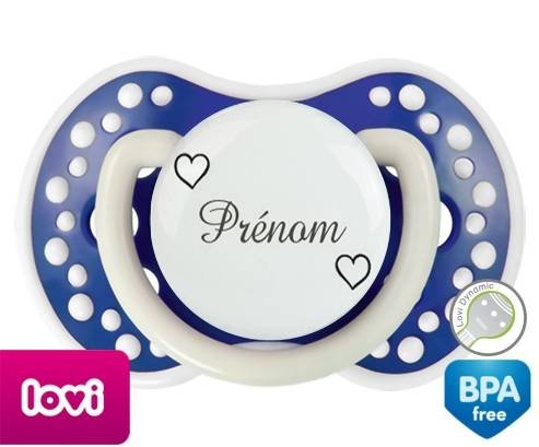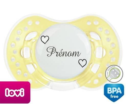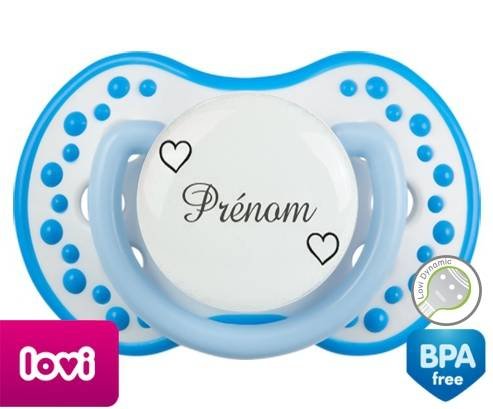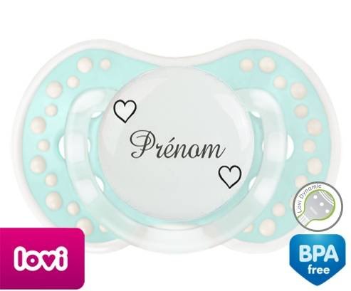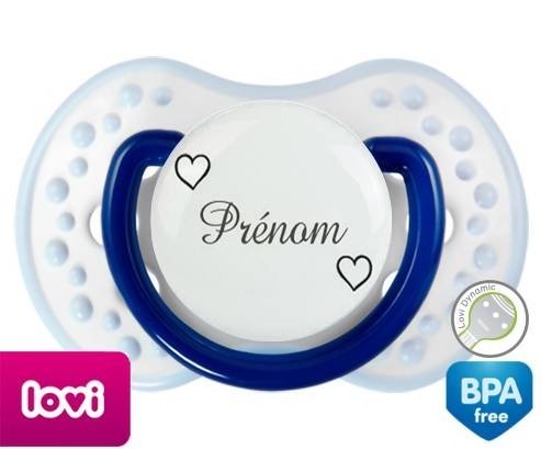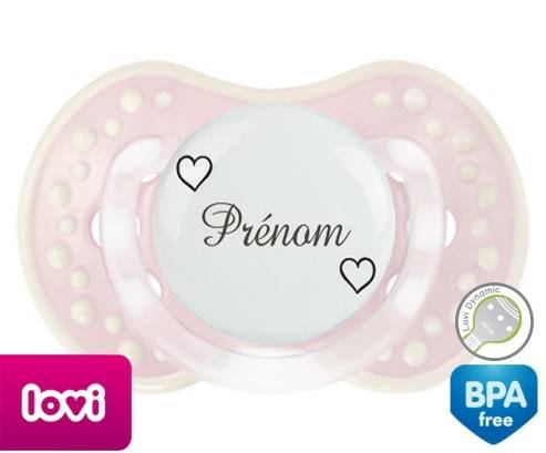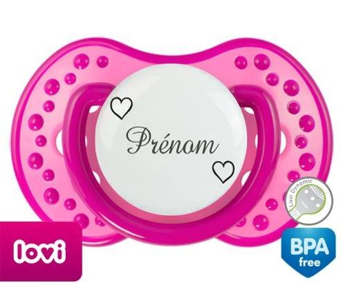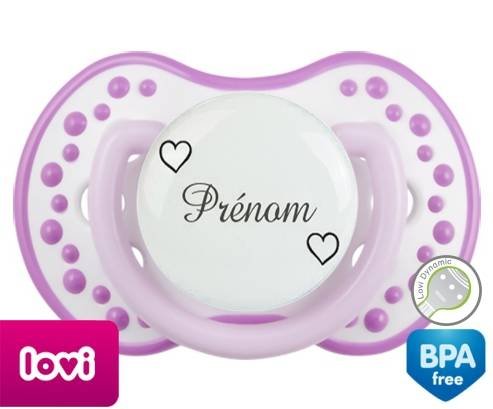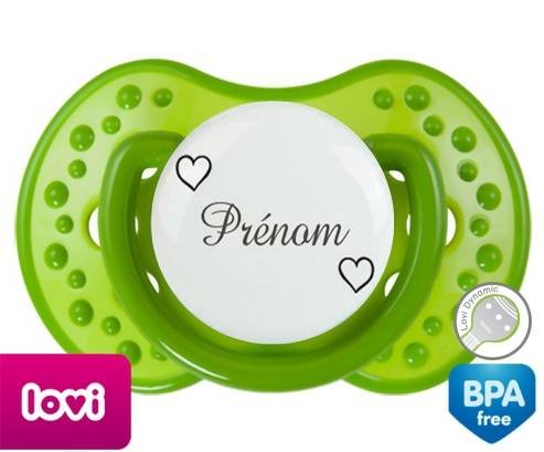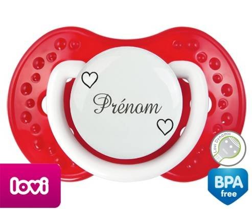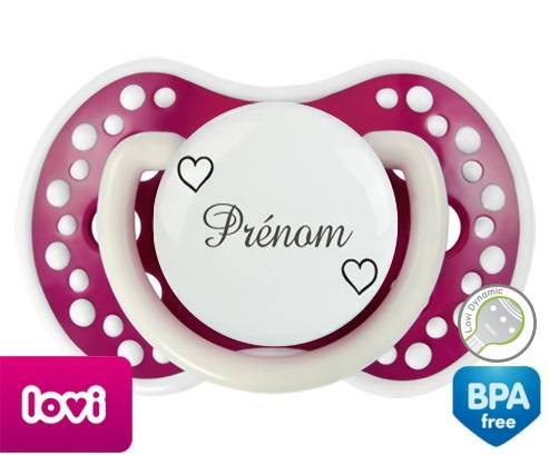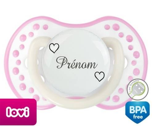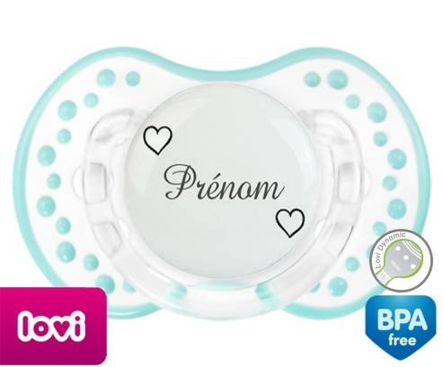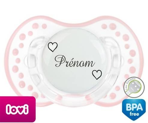 Sucette personnalisée pour bébé 2 cœurs blancs + prénom à embout LOVI Dynamic en silicone de la marque Lovi Dynamic avec impression en en Gris de la collection Prénom personnalisé.La silicone se reconnaît par sa couleur transparente. C'est une matière souple, douce, sans goût ni odeur et offre à bébé une succion plus facile grâce à sa souplesse.