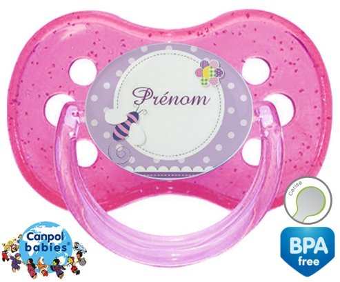 Sucette personnalisée pour bébé Abeille violet + prénom à embout Cerise en silicone de la marque Canpol Babies avec impression en en Couleurs de la collection Prénom personnalisé.La silicone se reconnaît par sa couleur transparente. C'est une matière souple, douce, sans goût ni odeur et offre à bébé une succion plus facile grâce à sa souplesse.