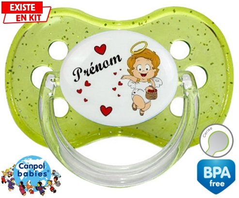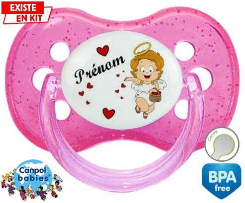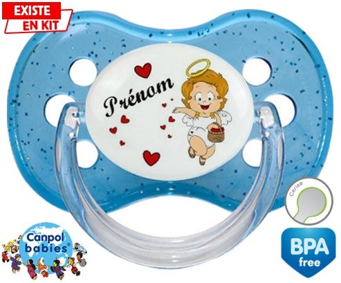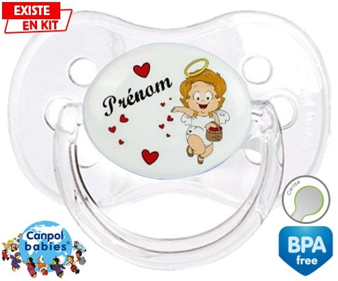 Sucette personnalisée pour bébé Ange cœur + prénom à embout Cerise en silicone de la marque Canpol Babies avec impression en en Couleurs de la collection Prénom personnalisé.La silicone se reconnaît par sa couleur transparente. C'est une matière souple, douce, sans goût ni odeur et offre à bébé une succion plus facile grâce à sa souplesse.